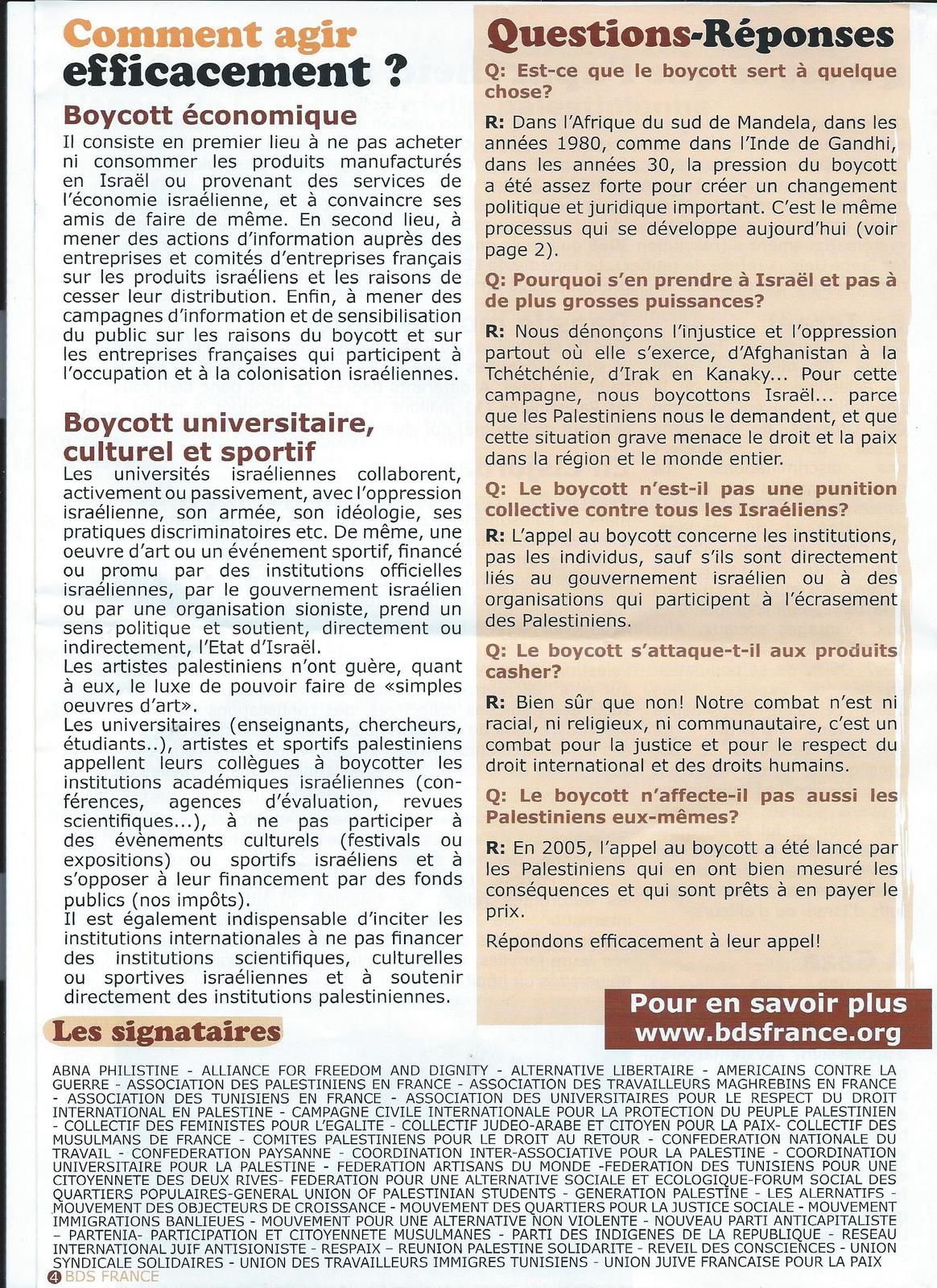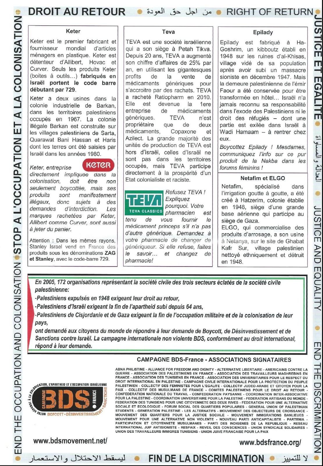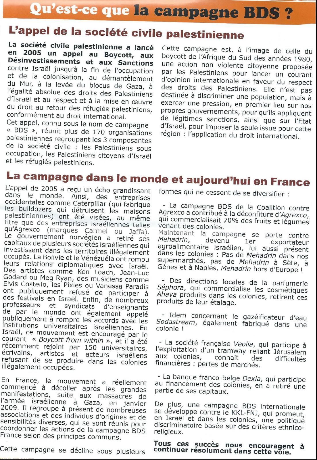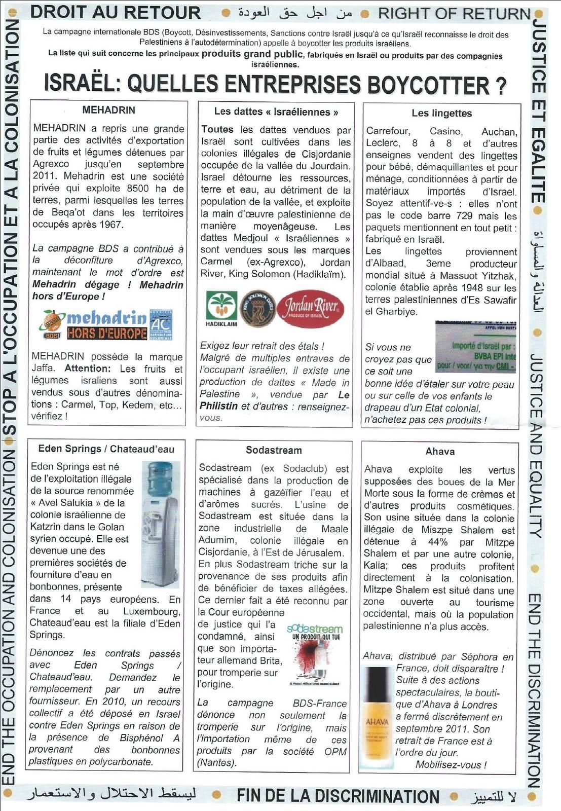 de l'AFPS (http://www.france-palestine.org) et aussi les tracts et pétition de la Coalition 63 Contre les Produits des Colonies Israéliennes.